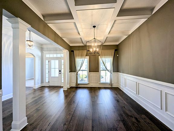 As you step into the inviting foyer, you'll be immediately drawn to the elegant formal dining room, adorned with coffered ceilings, setting the tone for the luxury that flows throughout the home. The open-concept great room, featuring tray ceilings and a cozy gas log fireplace, is perfect for both relaxing and entertaining.