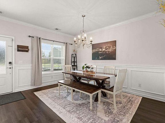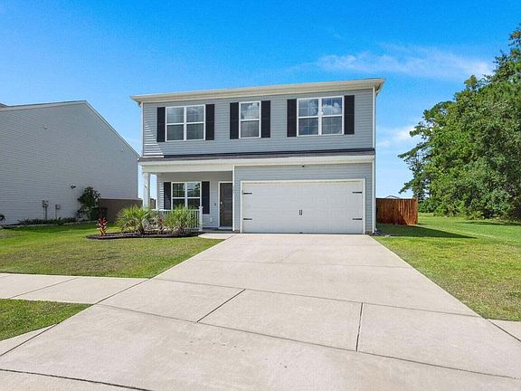 This charming traditional-style home is nestled on a peaceful pond-front lot in a quiet cul-de-sac in Mackey Farms, just steps from the neighborhood playground and dog park. A treeline along one side enhances privacy, while the attached two-car garage provides ample space for parking and storage. Inside, you'll be welcomed by luxury vinyl plank flooring, 9-foot ceilings, crown molding, and wainscoting. The open floor plan is bathed in natural light, perfect for both everyday living and entertaining. The gourmet kitchen showcases granite countertops, stainless steel appliances, a shiplap-accented island with a breakfast bar, two custom wood-shelved pantries, and a stylish subway tile backsplash. The formal dining room is ideal for hosting gatherings, and a built-in drop zone adds extra convenience. Upstairs, the master suite is a tranquil retreat with a tray ceiling adorned with cedar beams, a walk-in closet, and a spa-like en suite bath featuring a garden tub, walk-in shower, dual vanity, and shiplap accents. The additional bedrooms are generously sized, and the laundry room is conveniently located on the same floor. Outdoors, the covered patio opens to a spacious privacy-fenced backyard, ideal for entertaining, grilling, or relaxing. The home is also conveniently located near shopping, dining, schools, and Roper St. Francis Berkeley Hospital. Refrigerator, washer, and dryer convey with an acceptable offer and as part of the sales contract.