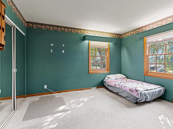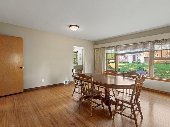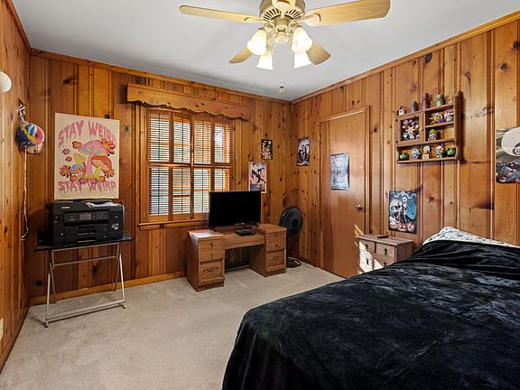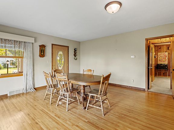 Welcome to this charming 1 1/2-story, 4-bedroom, 3-bathroom home on a 0.55-acre corner lot with over 1,900 sq. ft. of living space. The home features beautiful wood flooring, custom finishes, and a masonry fireplace that creates a cozy, rustic feel. The spacious living room flows into a fully equipped kitchen with a built-in booth and a formal dining room. A half bath is on the main floor, a full bath on the second, and a 1/4 bath with a shower in the basement. Enjoy outdoor living with a concrete patio, wood deck, and two double garages, perfect for storage or a workshop. The large yard, complete with a basketball net, offers endless opportunities for outdoor fun and activities. This home is truly a rare find!