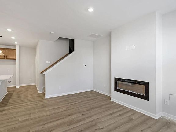 This elegantly designed two-story townhome features a rear-entry two-car garage and an open-concept layout. The great room includes a modern electric fireplace, creating a warm ambiance. The L-shaped kitchen is enhanced by burlap cabinetry, quartz countertops, and a stylish white subway tile backsplash. Adjacent to the kitchen are a powder room and a spacious storage closet for added convenience. The upper level includes three well-proportioned bedrooms. The expansive primary suite features dual walk-in closets, dual vanities, and a sizable walk-in tile shower. Two secondary bedrooms and an additional full bathroom are located on the opposite side, along with a versatile loft area and a laundry closet, optimizing space and functionality.