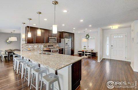 Ranch home that captures the breath taking Colorado mountain sunsets from the kitchen, living room, large back patio and outdoor gas firepit feature. Kitchen has been completely redone with tall cabinets and pulls, granite counter tops, stainless steel appliances, plumbing and light fixtures. Enjoy the easy flow of the spacious kitchen to family room with large island for gathering and entertaining. Downstairs bar and media room. Engineered wood through out the main floor for clean easy upkeep. NO METRO AND NO HOA. Boats and RVs allowed and ample room to park on large driveway. Quaint and dynamic Berthoud Old Town Business District with breweries and shops close by. Berthoud Community Rec Center ready in 2021 less then 3 miles.TPC Golfcourse less then 4 miles away. Estes Park, Boulder, Ft. Collins are within 45 minutes drive. We invite you to visit this low maintainence ranch home and live the Colorado small town life to its fullest.