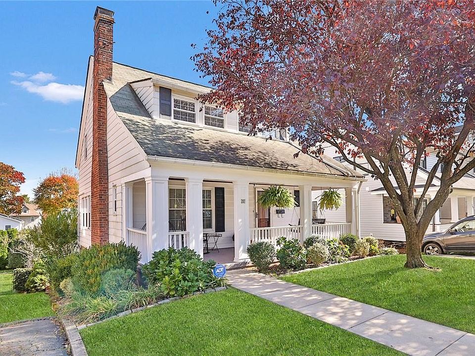 - Description: Charming Front Porch entry leads to Living room with brick fireplace, Dining room, Eat-in Kitchen with door to deck, Powder room,