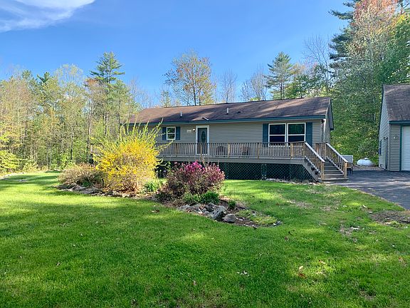 A country setting, surrounded by woods and a great neighborhood, this immaculate three-bedroom ranch has the privacy you need on 2 acres of land. The paved driveway leads you to the two-car detached garage. This garage has exterior stairs to an unfinished upper level where there is potential for more living space. Head to the house onto the wrapround composite deck that overlooks the private and lush lawn. The garden beds are full of beautiful perennials that require little maintenance. Inside the front door or the side double sliders enjoy single-level living with vaulted ceilings in the open dining, living and kitchen space. Natural light pours into the living room through the transom windows above the sliders. The full basement is unfinished if one needs more space that has great potential for added living quarters. Enjoy the convenience of having a generator for the home and you are located less than ten minutes to downtown, so enjoy several nearby golf courses, parks and outdoor trails. This quiet country road has easy access to Route 28 making for an easy commute to all your destination needs