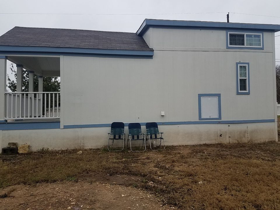 Mini House FOR SALE by owner MUST BE MOVED. The land does not belong to the homeowner and is not for sale. Contact Donna at 830-370-3626 for information or to schedule a time to look at it. The tongue and tires are still attached to the home for moving purposes. The external electrical box is attached to the home as well. This home is 399 square feet, this makes it able to be categorized as an RV. Because of the RV status, yearly homestead taxes are avoided. It is perfect for a single person and has everything you need. It was custom designed for maximum indoor space. It has 1 bedroom, 1 bathroom, Living Room/Kitchen with vaulted ceilings, washer/dryer hookups, and a 4 foot tall loft. The stove is included, as well as the central AC/heating unit. A king mattress and box spring are in the loft and can stay in the house. There is a set of stairs attached to the porch and custom built skirting that will need to be removed when moving, but is included with the trailer. The skirting was required by the city for move in inspection.