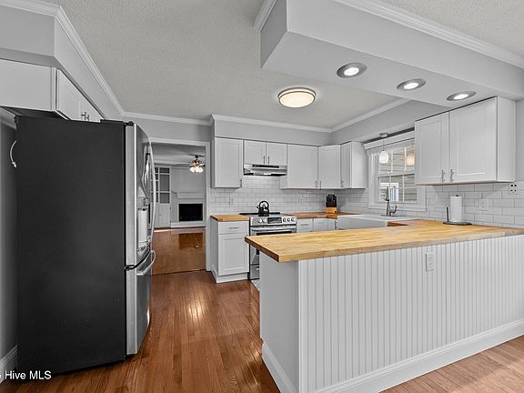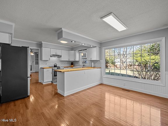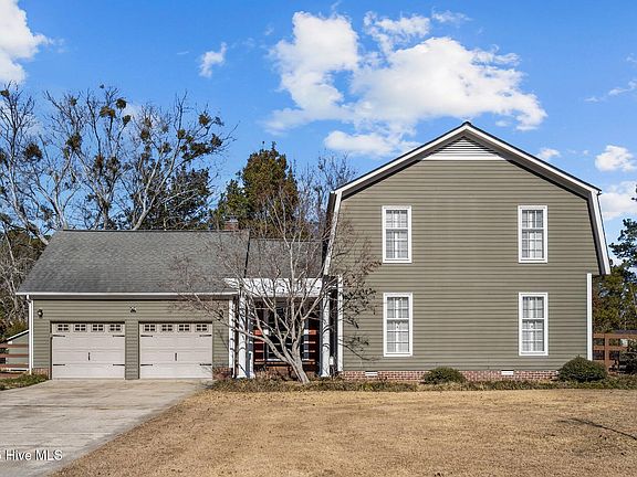 Discover this delightful 4 bedroom, 3 1/2 bath home that combines timeless charm with thoughtful updates. Designed with comfort and functionality in mind, this home offers spacious living areas refreshed to meet today's lifestyle needs. The updated kitchen is a standout feature, boasting butcher block countertops, stylish cabinetry, a farmhouse sink, and newer appliances, creating the perfect hub for cooking and entertaining. Custom moulding throughout parts of the home adds a touch of elegance and character to the already inviting space. Fresh paint further enhances the warm and modern ambiance. The spacious owner's suite is a true retreat, with generous walk-in closets and a well-maintained ensuite bathroom with double vanities and a rainfall shower. A highlight of the home is the sunroom—a serene, light-filled space perfect for relaxing, reading, or enjoying the view of the landscaped yard. Step outside to the fenced backyard, where you'll find a peaceful haven complete with a drive-in and 2 walk-in storage sheds, a convenient drive-through gate, and ample space for entertaining or projects. Enjoy the natural beauty of the area as wildlife often makes an appearance, adding to the tranquil atmosphere. Located near a picturesque golf course, this home offers the perfect blend of recreation and relaxation. With no HOA, you'll have the freedom to truly make this move-in ready home your own. Conveniently situated near Camp Lejeune, schools and shopping, this property combines the best of past and present. Schedule your tour today and make this charming home yours!