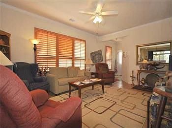 Charming Bluebonnet w/greenbelt view, NO STEPS, 2 bedrooms, 2 baths plus den/office, screened rear patio & within walking distance of the amenities. Has planatation shutters, window treatments, lots of ceramic tile, carpet in guest bedroom, vinyl in guest bath & utility room.. SileStone counter tops, tile backsplash, ceiling fans, crown molding, raised panel doors, gas water heater, water softener. Dual sink vanity in master bedrm w/built-ins in walkin closet. Come,relax-this is the perfect home. Offered by The Stacy Group.