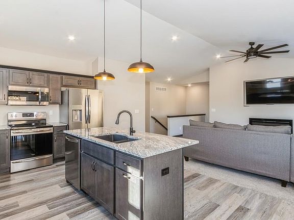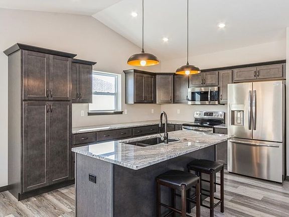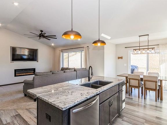 Impressive, like new, main level living, ranch style home conveniently located close to school. This extremely well maintained home features an open concept with soaring vaulted ceilings, neutral paint, and trendy fixtures throughout. The sleek kitchen includes stainless steel appliance package, pantry, eye-catching dark grey cabinetry with crown molding and soft close features, striking granite countertops, trendy LVP flooring, and dining space with slider leading to the deck. The living room features a cozy fireplace and picture window allowing much natural light. Main level laundry room with washer and dryer included. Primary suite features fabulous trey ceiling, spacious walk-in closet, full bathroom with stand-up shower, elevated vanity with dual sinks, and linen closet. Two additional guest bedrooms with walk-in closets and full bathroom with tub/shower, elevated vanity, and LVP flooring. The unfinished lower level is the perfect spot to add your own touch and include additional bedrooms, bathroom, and family room. Spacious 3 stall, attached garage. A fence and patio with retaining wall were recently added to the backyard making it a great spot to entertain.