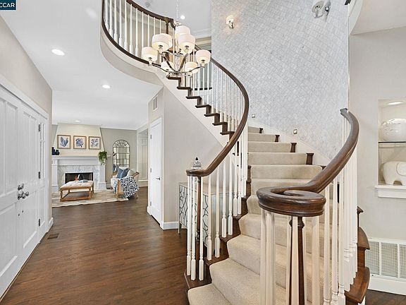 Amazing opportunity to own a beautiful custom home in Alamo's highly coveted private neighborhood, Stonegate. Adorned with designer finishes, a dramatic floor to ceiling Carrara Marble Wall flanks the circular staircase, recessed lighting, extensive use of crown molding, trim and craftsman millwork in the living room, dining room and butler's pantry, kitchen and bedrooms. Approximated 4132 SF of living space in the 6BDR 5.5BTH residence with Elevator. The Primary Suite is private and luxurious, the bathroom is a true spa experience with dual vanities, oversize shower, marble floor & counter tops, updated fixtures and soaking tub. Private Deck off the primary looks west to stunning views and gorgeous sunsets. Also on the second floor a bonus room with large picture window for family time and relaxation. 4 additional bedrooms & 2 baths are located on on the second floor + laundry room. Special features of this property include a full suite downstairs, elevator service to the second floor, folding accordion doors for seamless indoor/outdoor entertaining, lap pool, low maintenance, drought resistant landscape, covered patio, sun deck and twin oak tree retreat at the top of the property. 24 Hour security guard, tennis courts, plenty of green space, hiking & walking trails.