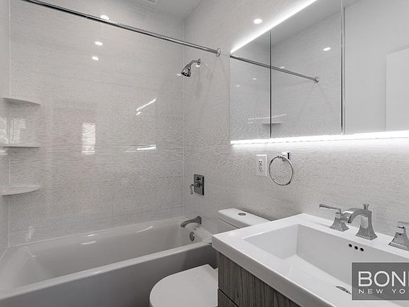 The apartment features massive windows, tons of natural light, updated appliances, a large alcove kitchen, sleek modern counter-tops, a spacious living area, Central Heat / AC, Stunning Hardwood Floors, three large closets, lots of natural light, high ceilings, a marble bathroom, and shaker cabinets!