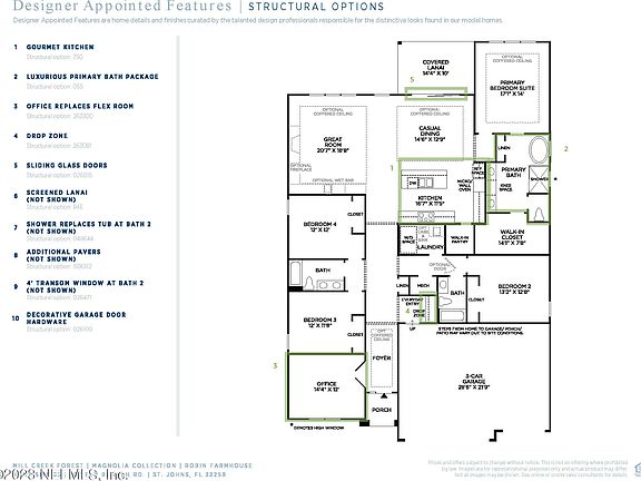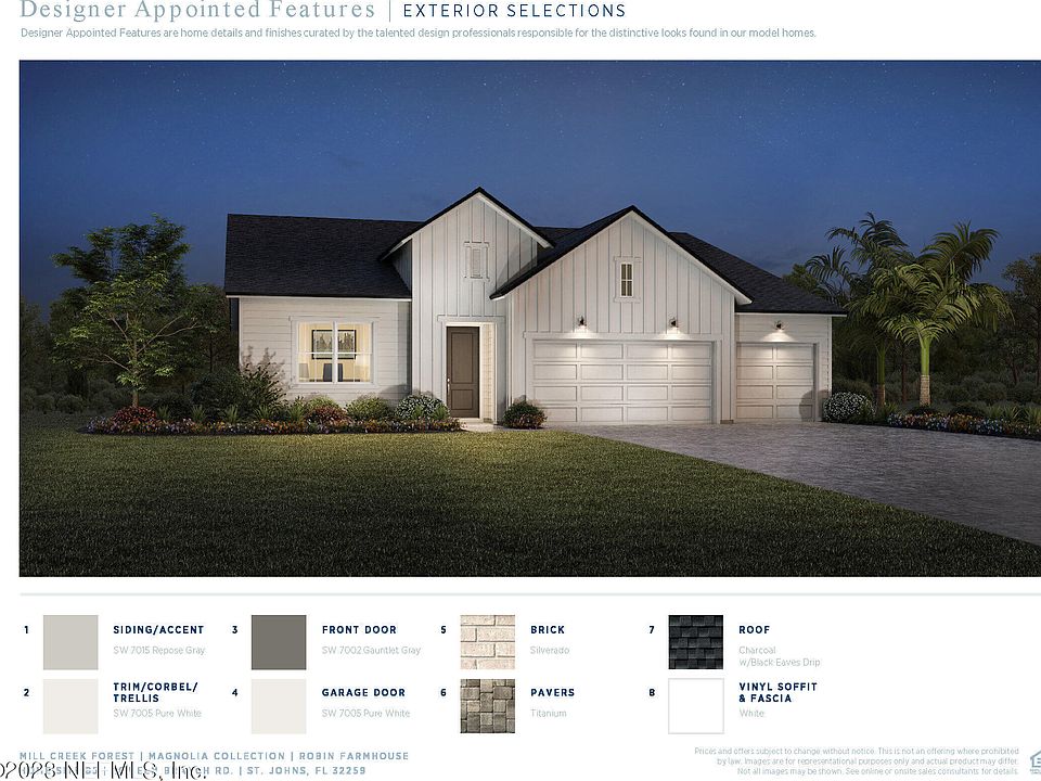 **Completed Home**Short Distance to TOP RATED SJC Schools and Grocery. NO CDD FEES, Natural Gas Community located in the heart of SJC. This beautiful Robin Farmhouse home is a ranch style plan featuring 10' ceilings, a primary bedroom on the first floor, casual dining room, and office. The gourmet kitchen with wall oven & microwave, drop zone, and screened lanai are a few of the selected features. 3 car garage. Tankless Water Heater, Pre Plumb for Water Softener, Fully Irrigated with gutters. Amenity Center to include Clubhouse, POOL, FITNESS CENTER, TENNIS COURT, TOT LOT, AND WALKING TRAIL.