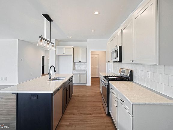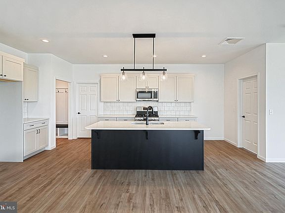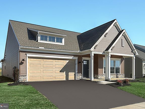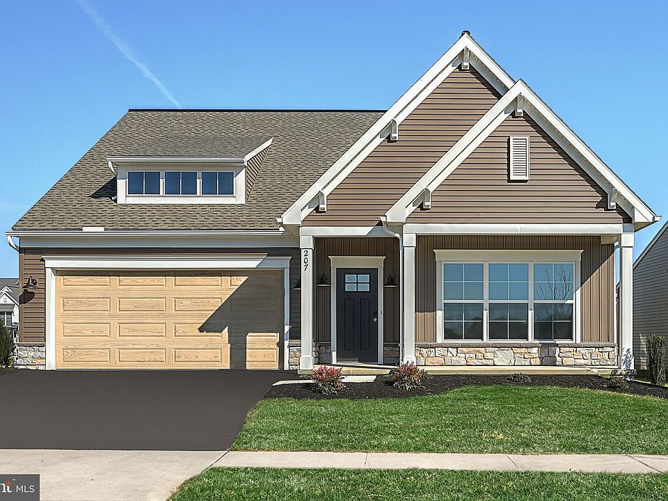 This 1-story home with a welcoming front porch and designer details includes a 2-car garage and 9’ ceilings on the first floor. The garage opens to a mudroom entry with built-in bench seating and access to the laundry room. Beautiful luxury vinyl plank flooring flows throughout the main living areas. The kitchen is well-appointed with upgraded appliances, quartz countertops with tile backsplash, a spacious pantry, and a large center island, which opens to the great room. A cozy gas fireplace with stone surround warms the great room, and is beautifully flanked by windows. A sunny dining area with triple windows provides sliding glass door access to the screened in porch. To the rear of the home, the owner’s bedroom with tray ceiling detail features an expansive closet and a private bathroom with two vanities and a tile shower with seat. A second bedroom, full bathroom and flex room are found at the front of the home.