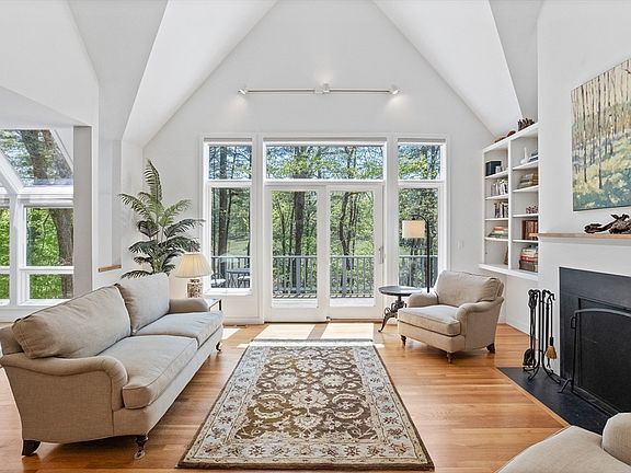 This custom Acorn designed home on 5 acres abutting Conservation land is a nature lover's paradise. The post and beam construction creates bright, open spaces where walls of windows and skylights bring the outdoor beauty inside. The bright, fully applianced kitchen with walk-in pantry, slate flooring and cherry cabinets opens into the dining room and family room where custom bookcases flank the fireplace and its spaciousness is enhanced by the vaulted ceiling. The living room with triple window and built-ins could be used as an office or bedroom. Main bedroom with walk-in closet and en suite bath, combined with convenient 1st floor laundry, offer potential for one floor living. Shared bath and 2 large bedrooms upstairs, one with cedar closet and walk-in storage. Huge expansion potential in the walk-out lower level with new Pella windows. Relax on the two decks or screened porch and enjoy your serene, private sanctuary or explore the miles of nature trails.