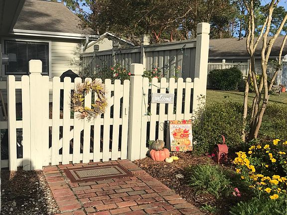 Three bedroom, two full bathroom townhouse in established community of Inland Greens. Includes attached 2 car garage, private fenced courtyard, and beautiful rear sunroom. Foyer upon entry with kitchen at left. With granite countertops, stainless steel appliances and recessed lighting. Dining room divides common space. Living room offers cathedral ceiling with 2 sky lights and corner wood burning fireplace. Master bedroom at rear of layout has two double-door closets, private full bathroom, and access to rear sunroom via French doors. Sunroom has brick flooring and dual sliding doors to patio overlooking shared green space and pond. Community offers residents use of a clubhouse, swimming pool, tennis & pickleball courts, maintained walking trails and golf course. Close to diverse shopping & dining, historic attractions & super close to area beaches including Wrightsville Beach! Easy access to cross city trail. Easy access to HWY 17 and Eastwood Road. Short commute to UNCW Main Campus and Wilmington International Airport. Application must be completed, $50 application fee. Co-sign required for students. Non-smoking residence. Non-refundable pet fee required.