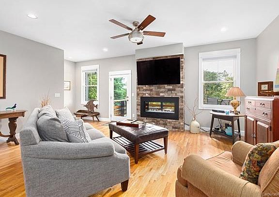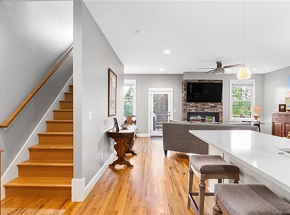 Beautiful, modern and bright tri-level townhome with Southern exposure and long-range views of the Western mountains. Open, flowing floor plan with great light and lines. Nine-foot ceilings throughout. Third level master suite with sitting area. Covered deck, luxurious master bath, and large walk-in closet. Open kitchen with seating around the quartz countertops. KitchenAid stainless appliances and ample cabinets with pull-out pantry. Gleaming wood floors throughout. See-through fireplace with custom tile surround. Oversized one-car garage, level drive and no-stairs entryway. Laundry on main with custom cabinets that match kitchen. Minutes to Merrimon Avenue and Downtown Asheville amenities. Equal distance to Weaverville shopping and restaurants. Walk to YMCA, Reynolds Village shops. Turn-key, lock-and-leave, low HOA, includes Master insurance.