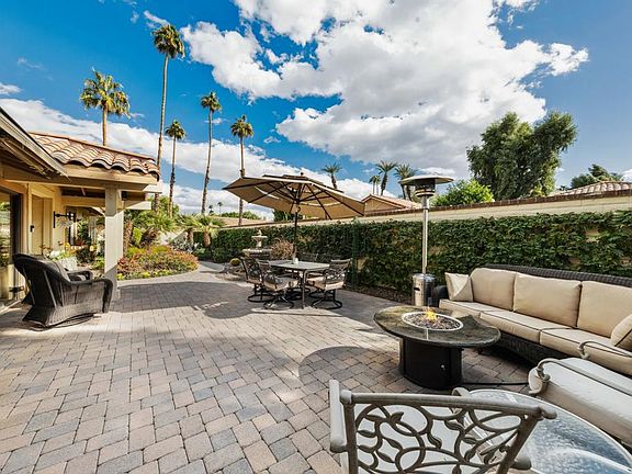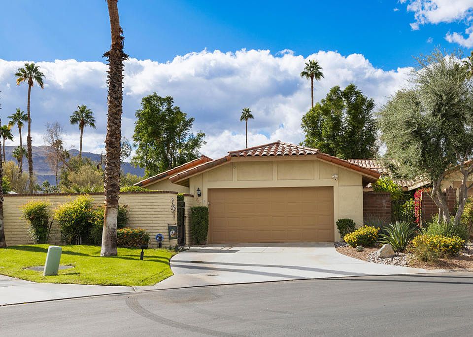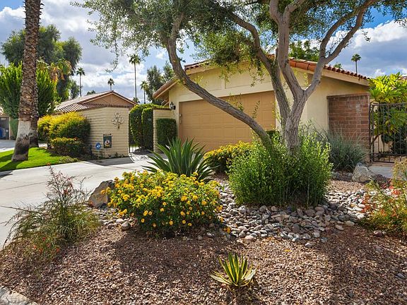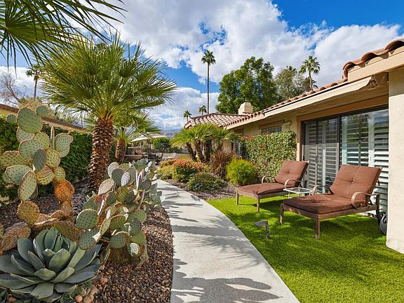 PRIVATE SIDE YARD | VIEWS, VIEWS, VIEWS!Marvelous Desert Homes presents a one-of-a-kind, completely remodeled 2-bedroom plus den home with one of the best locations in the vibrant, gated Monterey Country Club. This 1,800-square-foot property is located at the end of a private cul-de-sac, just steps from the pool. The gated, private side yard features stunning upgraded landscaping and pavers, creating a beautifully manicured outdoor space. The west-facing extended patio offers breathtaking sunset views of the golf course, water, and mountains.Inside, the atrium has been converted, adding valuable space to this luxuriously designed home. The primary bedroom features a custom walk-in closet and an upgraded bath with granite countertops, a walk-in shower, and elegant double vanities. The kitchen is highlighted by additional windows, granite countertops, custom cabinetry, and high-end appliances--plus amazing views!Monterey Country Club offers a 27-hole golf course designed by Ted Robinson, 37 pools and spas, as well as pickleball, tennis, and bocce courts. A clubhouse with year-round activities makes this a fun and friendly community. Just a short distance from El Paseo, the 'Rodeo Drive of the Desert,' you'll enjoy high-end shopping, dining, and entertainment.Combining luxury, leisure, and a prime location, this unique home is a must-see. Call today for your private showing: Kay (760) 399-2420.