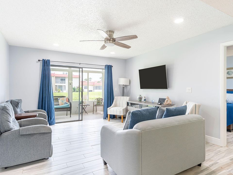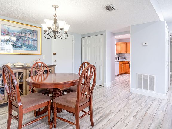 Beautifully renovated 2BR/2BA 1st-floor condo with a water view from each room. Spacious primary bedroom and walk-in closet. Located in an active 55+ guard-gated community. Recently fully renovated, this unit boasts HURRICANE IMPACT windows and sliding doors, new porcelain tile throughout, a new water heater, an updated kitchen with newer appliances and granite countertops. Both bathrooms have been tastefully renovated. Recessed lighting and new fans in every room. Custom-built cabinets in the walk-in closet. New washer and dryer inside the unit. Low HOA fee ($474/month) includes: cable&internet, water, building insurance, lawn care, pest control, 24h guard gate, several pools, tennis, cafe, billiard, courtesy bus and so much more. Easy to show, call for details today!