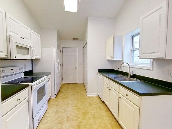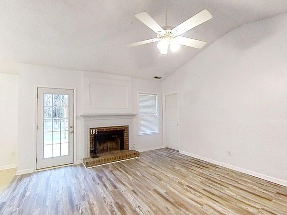 Terrific split-bedroom ranch at the end of cul-de-sac, backing to trees, fenced yard. Open plan, vaulted great room w/ fan & wood log fireplace, tile kitchen floor, newer microwave & stove. Refrigerator included. Two car garage. Fenced yard; pets OK with pet deposit. Spacious master w/ walk-in closet. Community swimming pool.
