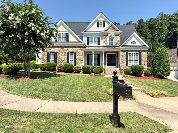 An immaculate 2006 custom-built residence nestled on a private 0.33-acre cul-de-sac lot, available on or after August 15. Located in one of Cary's most sought-after neighborhoods, this home offers timeless elegance, thoughtful design, and exceptional craftsmanship throughout. Featuring 5 bedrooms and 4.5 baths, the home boasts a dramatic two-story foyer and family room, a spacious main-level primary suite, a formal dining room, and a dedicated home office with French doors. The chef's kitchen is a true showstopper highlighted by a large center island, 6-burner gas cooktop, granite countertops, and an oversized walk-in pantry. Rich hardwood floors, detailed millwork, and arched double-tray ceilings underscore the home's refined character. Step outside to enjoy peaceful outdoor living on a beautifully landscaped lot backing to evergreen trees. The generous 3-car garage and unfinished attic provides ample storage for your needs. This move-in ready gem combines luxury, comfort, and convenience just minutes from greenways, top-rated public schools, major employers, and several premier private schools including Cary Academy and The Raleigh School.