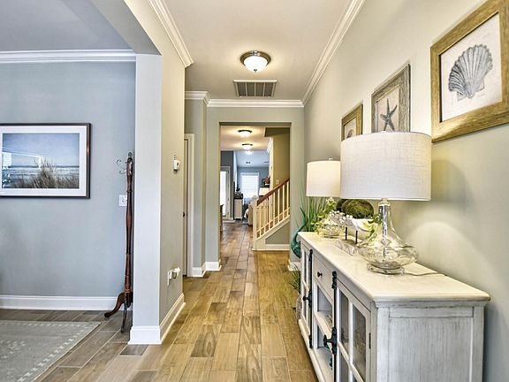 SHOWS LIKE A MODEL HOME!! Great location only a short golf cart ride to the beach! Enter the home to a huge foyer and formal dining room. There are 2 master suites, one downstairs and one upstairs with a sitting area. The eat in kitchen features granite countertops, tile backsplash, work island, pantry and upgraded stainless steel appliances. The large garage has a utility sink, side door to the yard and an extra refrigerator with an ice maker. This gorgeous home has so many extra features! Smooth ceilings, crown molding, 5 1/4 baseboard, 7x20 hardwood style tile flooring,dbl vanity in the master bath and trey ceiling in the master bedroom, vaulted ceiling in the living room, ceiling fans in all the bedrooms, and tons of storage. The upstairs living room opens onto the 2nd floor balcony. Outside is a private oasis with a wooded lot and 6 foot privacy fence, covered back porch with retractable screen door, and a huge paver patio area that's great for entertaining. HOA includes landscaping and lawn care. Schedule an appointment today! This lovely home is a MUST SEE!!