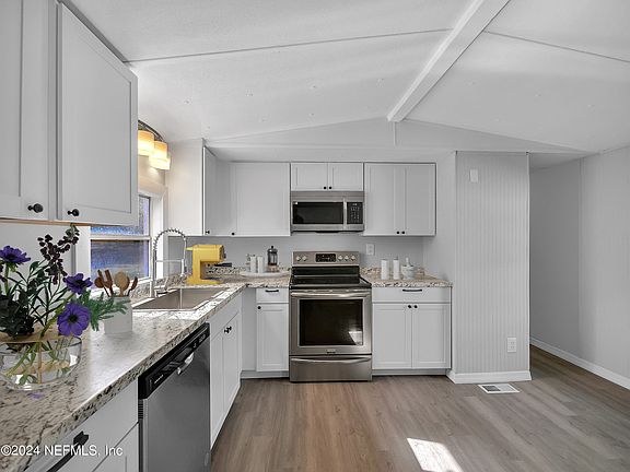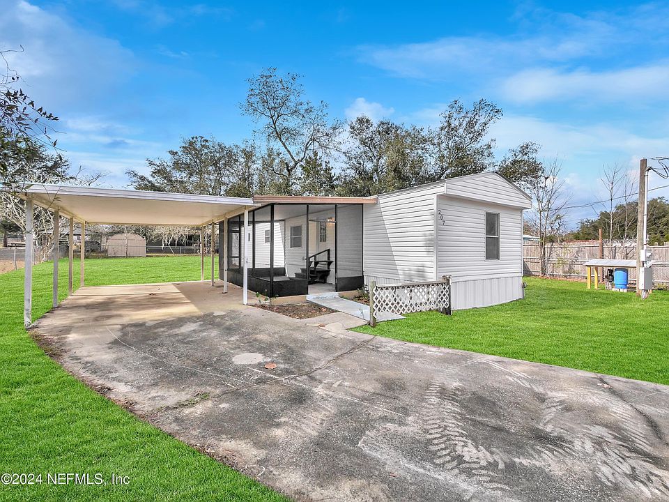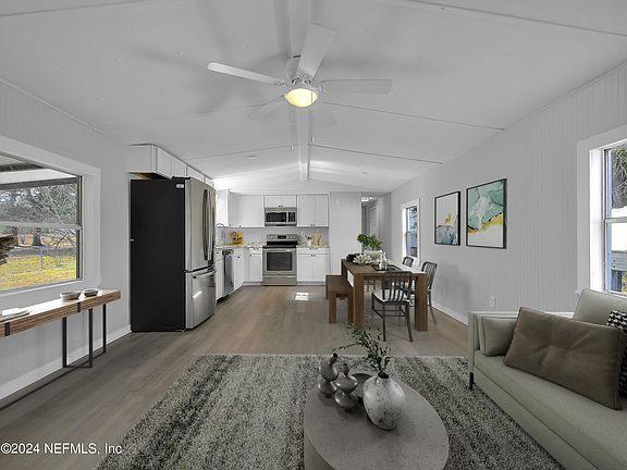 Move-in ready and completely revitalized 2 bed/2 bath home with screened porch, two carports and a utility shed on nearly a quarter acre! The open floor plan features new flooring, paint, appliances, as well as kitchen & bathroom remodels. The home has also been updated with a new metal roof, siding, well pump, water heater, AC & plumbing. This serene location is close to many beautiful lakes - find your outdoor paradise today!