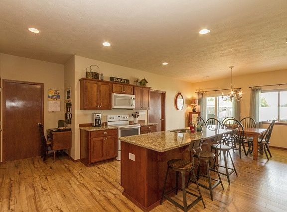 2br/2ba home with covered back deck and oversized 3 car garage and covered back patio. No step entry with hardwood laminate floors, granite countertops and updated cabinetry. Full sprinkler system with 6' high vinyl fenced backyard. Sellers wanted room to build a shop so they are moving. A great opportunity for you buyers. 10x16 garden shed wired, insulated, and sheet rocked.
