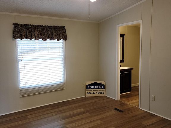 Mobile Home, completed renovated, new appliances: Dishwasher, refrigerator, range and microwave. New master bath complete with large linen closet and two vanities. Large kitchen with island along with dining area open to family room. Three bedrooms and two full baths. Nice front and back porch. Beautiful park like setting in small mobile home park. Conveniently located on the north east side of Anderson- close to 29 and 81. Minutes from Anderson University, AnMed and downtown Anderson. No smoking or vaping, small indoor pet only with pet deposit Renter is responsible for utilities, no smoking or vaping, parking area is provided, park rules must also be followed. 1 year lease required.