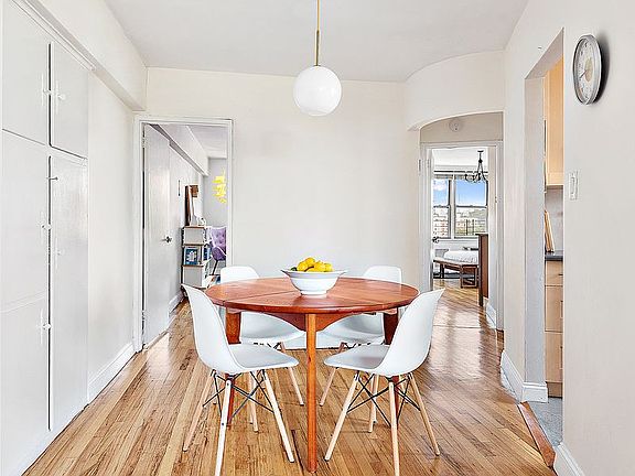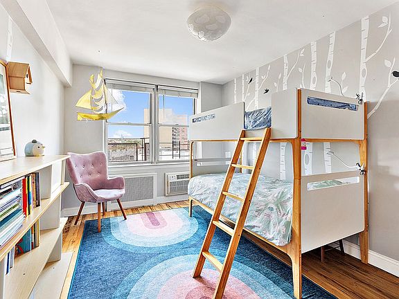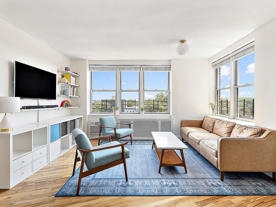 This top floor 2 Bedroom 2 Bathroom Coop is filled with natural sunlight, and has spectacular views from five over-sized windows with both east and south exposures. The apartment was recently renovated, has hardwood floors, through wall AC units, and plenty of closet space and move-in ready. Situated on the most sought after, top (7th) floor of this well-run elevator building, 7A truly feels like a home. The large foyer has ample place for shoes and coats and is lined with closets, making it functional and inviting.