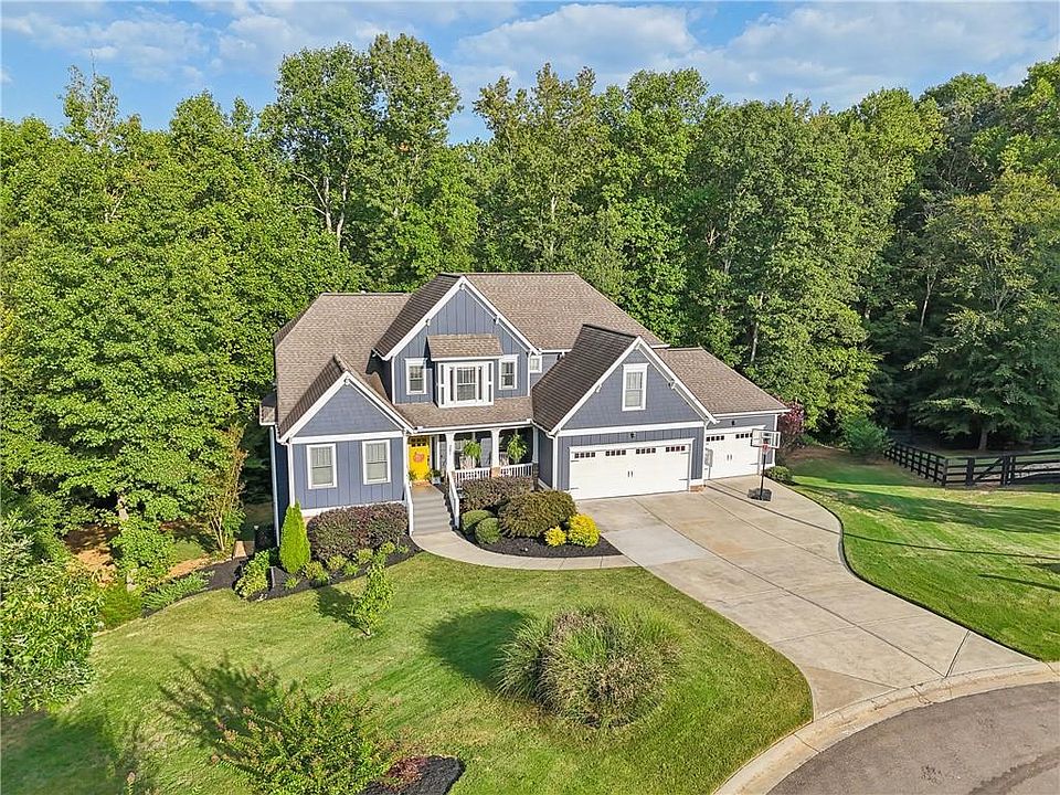 Gorgeous craftsman home in highly coveted Avery/Creekland/Creekview school district! Double decks and screened porch overlook nearly an acre of land! Level cul-de-sac lot in quiet subdivision features private backyard backing up to forest and babbling brook. New exterior paint, well maintained landscaping, and inviting front porch provide beautiful curb appeal. Inside you'll find an updated kitchen with shiplap breakfast bar , gas range, stainless appliances, and freshly painted cabinets. Oversized primary suite on main floor includes private bathroom with tile shower, garden tub, double vanities and spacious walk-in closet. Main level also features open concept living room perfect for entertaining with stacked stone fireplace, vaulted ceilings, large formal dining room, eat in kitchen, office space, walk-in pantry, and convenient laundry room. The upstairs level showcases 3 generous sized bedrooms, 2 full bathrooms and bonus room/additional office space. The full walk-out daylight basement boasts soaring ceilings, ample storage, stubbed bathroom, custom built-in playhouse and unlimited potential to finish to your liking. Conveniently located close to award winning schools , Northside Cherokee Hospital, and shopping in the highly desired East Cherokee/Hickory Flat area. This rare find will not last!