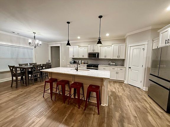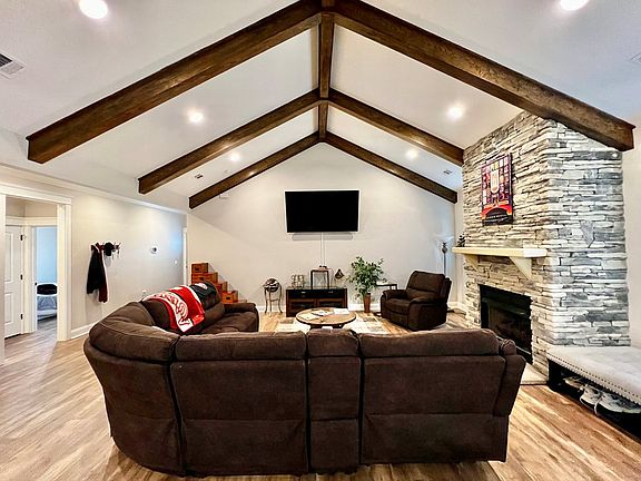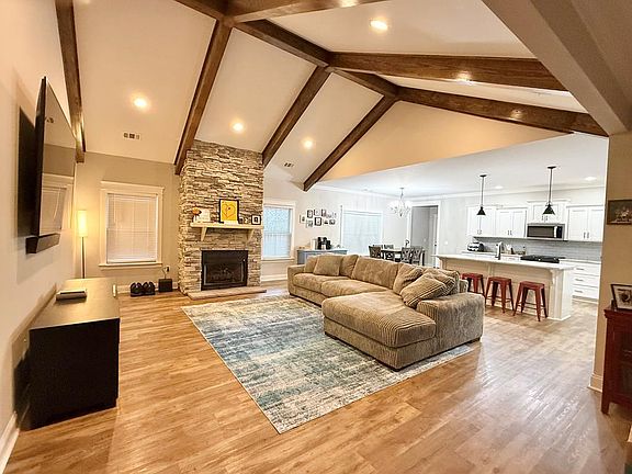 Built in 2020, this beautiful brick home features vinyl flooring throughout, vaulted ceilings with beams, and a stone fireplace with gas logs. The kitchen offers granite countertops, brand-new appliances, and a spacious pantry. The primary suite includes a double vanity, garden tub, tiled shower, and walk-in closet. Enjoy the paver patio and privacy-fenced backyard, plus a two-car garage for added convenience. Move-in ready and full of charm!