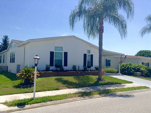 Enjoy beautiful lake views from this spacious and bright home. There is a large veranda room with windows across the entire backside of the house. Home also has a back set lanai and patio over looking the lake. In addition to the veranda room there is a formal living room and dining room with cathedral ceilings, transom windows, and beams. The outstanding kitchen has solid wood cabinets, breakfast nook, and a built in desk area. There is a split bedroom plan for privacy. There is tons of storage in this house too! A/C and duct work were replaced in 2013, hot water heater in 2015. Other updated features are appliances and flooring. Located in a 55+ leased land community with tons of activities and resort quality amenities.