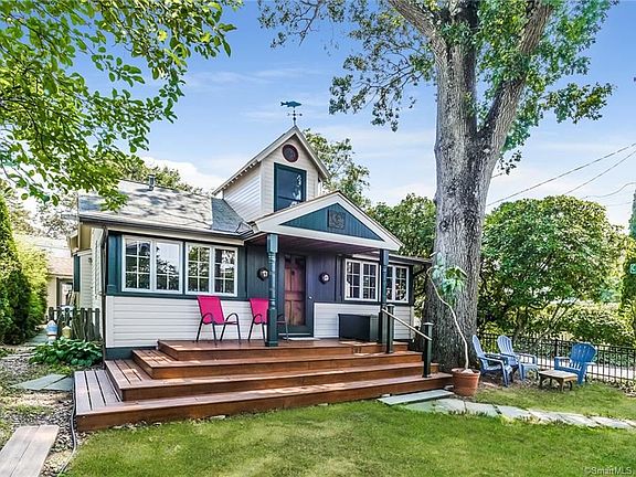 Truly one of a kind home remodeled by and previously owned by Vincent J. Scully Jr, Sterling Professor Emeritus of the Arts at Yale University. Mr. Scully was one of the nation's most influential & respected architectural historians. A professor at Yale for over 60 years. The homes exterior design is thought to have been inspired by the House of Seven Gables while the interior space resembles that of a sailing ship capturing the beauty & harmony of Connecticut's most sought after water community. From the antique ship doors, portal style window to catwalk balcony area, you will never find another home like it. Ocean view & breeze will be your daily inspiration. A light & bright space with 2 BR & full bath on the main floor. Spiral staircase will bring you to a spacious loft for additional bedroom or living space of your choosing. A detached cottage style garage is a perfect art studio, work shop, seasonal space for just about anything living near the water inspires you to do. Just steps away from the over 100 feet of association plush lawn, sandy beach, & private pier on the mouth of the Branford Harbor where you will be engaged daily with boats from all over the country. Lots of time this season to enjoy the pier, dock & sea wall which were all recently rebuilt. You will be hard pressed to find this boaters & beach dream home owners association with an annual fee of only $300! Your home is served with city water, sewer & natural gas & does not require flood insurance