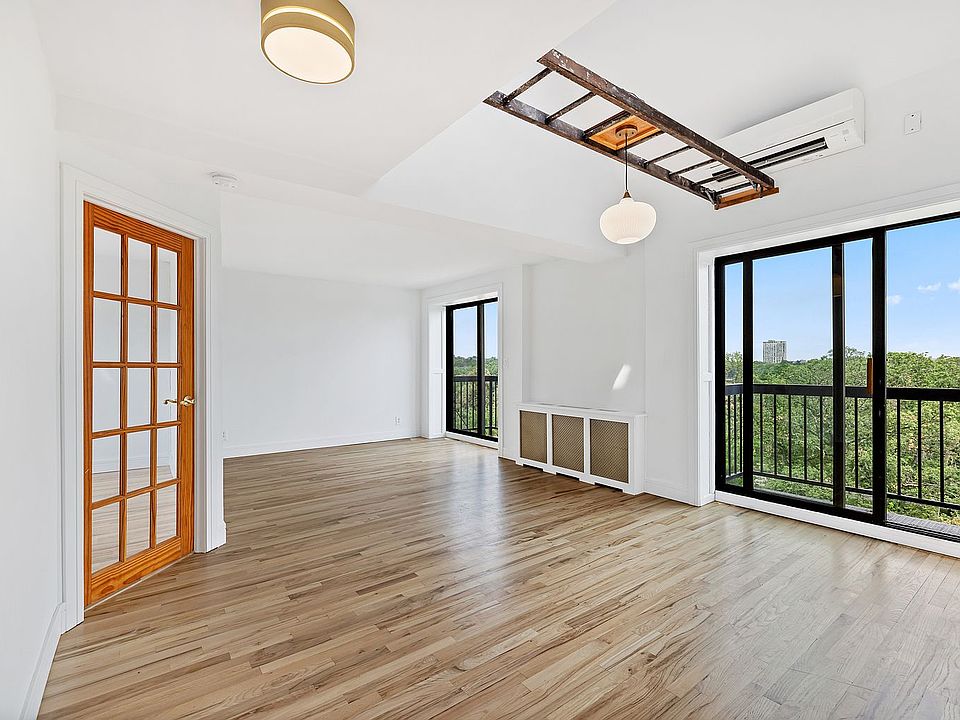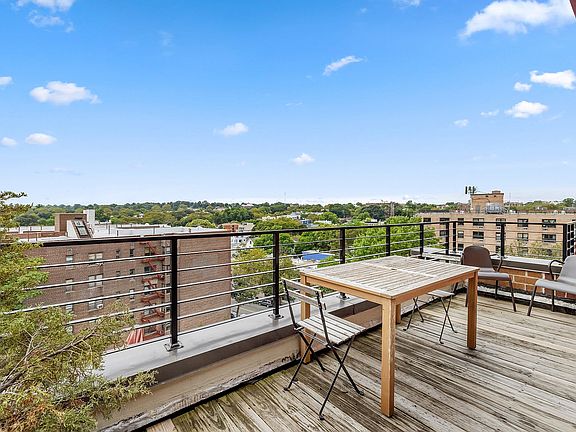 This penthouse with balconies offer panoramic views of Prospect Park, while the terrace provides a picturesque vantage point towards the Verrazano Bridge and a captivating sunset. This remarkable two-story condo on the top floor is bathed in natural light and boasts breathtaking vistas. The immaculate white contemporary kitchen, adorned with stone countertops, features modern amenities such as a dishwasher and a double stove, all while overlooking the lush park surroundings. Flowing seamlessly, the kitchen transitions into the double-height dining area and extends into the inviting living space, creating a perfect setting for hosting gatherings. On the lower level, there is a spacious bedroom and a sleek modern bathroom. Ascending the stairs, you'll find a mezzanine bedroom and a dedicated home office nook. Throughout the space, hardwood floors exude elegance, and ample storage solutions cater to your needs. This exceptional apartment also includes the added convenience of a parking space. This well maintained elevator building offers many amenities including an amazing birds eye view common roof deck overlooking Prospect Park, a large gym, a laundry room and free bike storage. The location is fantastic a short walk to the F and G trains at Fort Hamilton. Around the corner are some great local cafes and restaurants including the Cena, Della, Le Paddock, The Adirondack, and Hamilton's, Prospect Park Tennis Center and only 1 stop away by train to Park Slope.