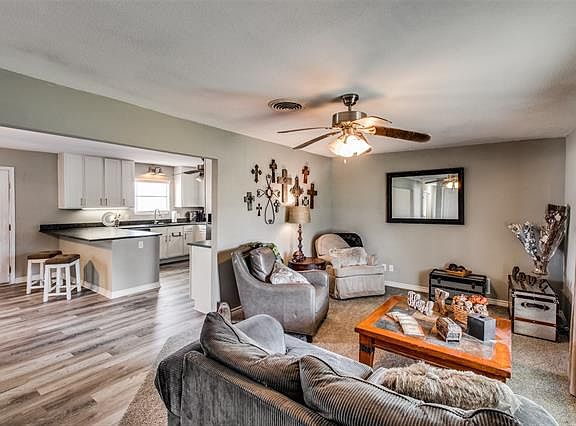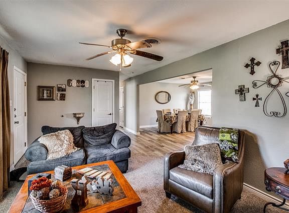 Huge Corner Lot, with lots of space! This Ranch style home is 3 bedrooms & has been well cared for. Updated & remodeled, it is move in ready! The highlights are a large covered front porch, lots of windows & natural lighting with an open floor plan. The kitchen has tons of cabinets, a breakfast bar, black electric appliances with a high end laminate flooring. Both bathrooms have been remodeled to give more space & still have a shower tub combo! 3 tall pine trees gives the backyard shade. Room for building a garage, shed or shop on the property. The current garage was converted to be additional storage, could be put back as a garage or have turned into more home. Great location to be living country, but in a small town & still about 1hr from DFW Airport. Purchase for your home or make a rental property, this home is low maintenance! Options for 0 down financing!