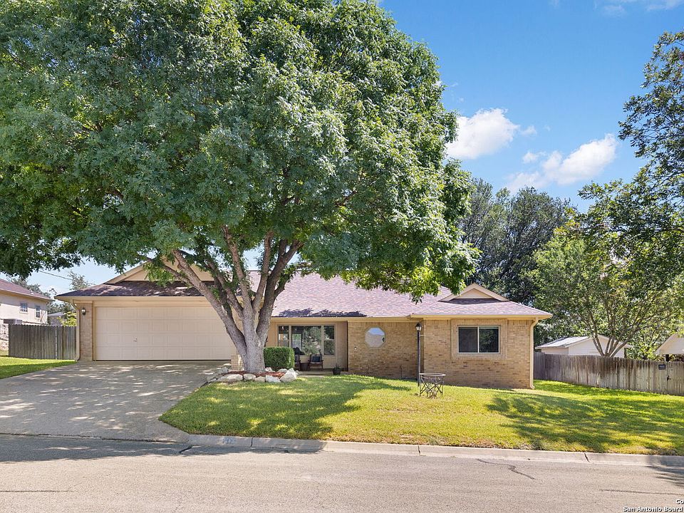 Nestled on a generous .36-acre lot in the welcoming Greenwood Forest subdivision, this well-kept home offers both space and comfort. Step inside to a bright, airy living area with high ceilings and abundant natural light, perfect for relaxing or entertaining. The layout features two large bedrooms and two full bathrooms, providing plenty of room for family or guests. Just a few steps up from the living area, the spacious kitchen and breakfast nook offer ample space for cooking and casual dining. Outside, you'll enjoy a large fenced backyard-ideal for pets, gardening, or simply soaking up the Hill Country air-plus a covered back porch for year-round enjoyment. A two-car garage provides convenience, and a beautiful shade tree graces the front yard, adding to the curb appeal. This home combines the peaceful feel of a small neighborhood with the charm of Ingram living.