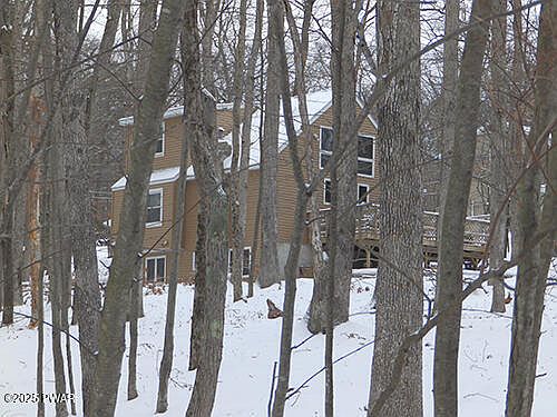 CONTEMPORARY TRI-LEVEL CHALET On a quiet corner on 2 parcels, Chalet offers wood floors, bright living room with glass door to large private deck, cathedral ceilings and new efficient wood stove stove, dining area, updated kitchen with appliances, 1st floor bedroom, 2 full baths, family room with wood stove, laundry with washer & dryer, gas heat, full basement, large storage shed, new vinyl siding, new roof and more. Short walk to access to 120 acre natural lake, close to clubhouse, beach, tennis, sport field and clubhouse with restaurant and sandy beach area., Beds Description: 1Bed1st, Baths: 1 Bath Level 1, Baths: 1 Bath Level L, Eating Area: Dining Area, Eating Area: Modern Kitchen.