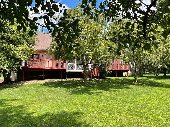Large Ranch with true separate In-law/caretaker/adult child floor plan on unfinished walkout basement with 3 car garage on nearly an acre lot . Less than 2 miles to I-64 in lovely spacious Royal Oaks Estates. Foyer opens to huge kitchen great room with fireplace, primary bedroom, 3 additional bedrooms. In-law suite has it's own full kitchen/great room, bedroom, full bath, individual deck off kitchen & shared laundry. Total of two decks plus a screened in covered deck between them. Large unfinished walkout basement with 3 car garage. Fishing rights to pond beyond property line. Farmland at dead end of street. Being sold as-is with inspections welcome. One year home warranty paid for by seller at closing.