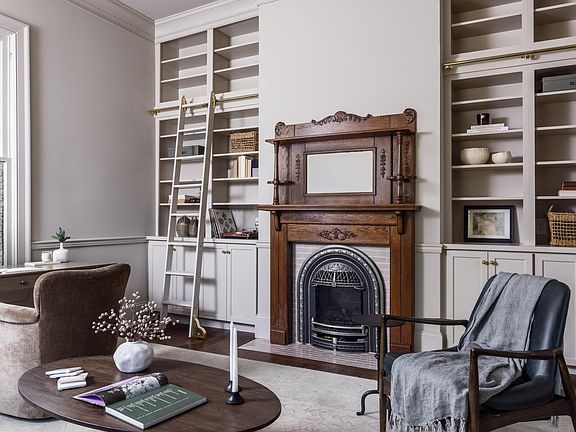 On the main floor you’ll find an office with custom shelves, ladder, integrated vinyl hook up and original oversized pocket doors.There are 4 working gas fireplaces, including one in the primary suite, along with a large walk in closet featuring a washer dryer hook up. The formal living room holds a custom wet bar topped with viola marble. In the great room you’ll find oversized Victorian windows and a custom 12 foot wide fully collapsible door for true indoor outdoor living. The stunning kitchen has paneled GE Monogram appliances and Taj Mahal galore! The scullery holds an additional dishwasher, full sized sink, 5 in 1 oven, fridge/freezer drawers and hidden desk.