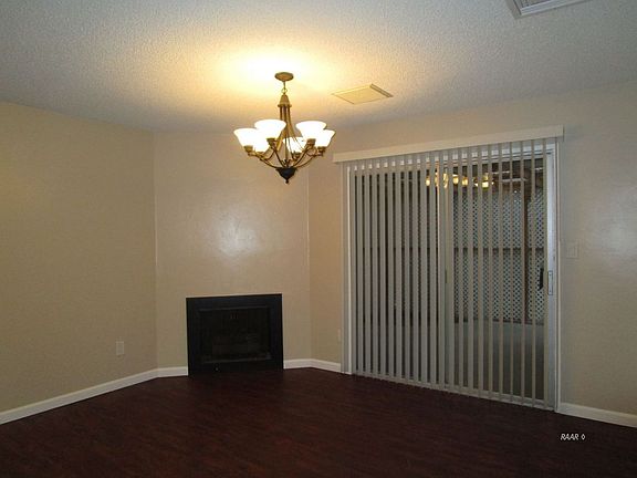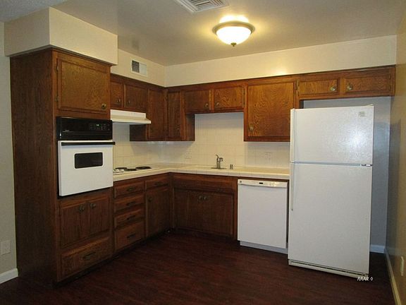 Spacious three bedroom, two bath unit. Eat in kitchen open to dining area with fireplace, vinyl wood flooring and sliding doors to patio. Vinyl wood flooring in living room, hallway, and laundry room areas. Carpet in bedrooms. Master bathroom has en suite.Guest bath and master bath have tile flooring. Washer/Dryer hook-ups inside unit. Nicely covered and shaded patio. Swamp cooler, A/C, and forced air heating. Refrigerator is provided but not warrantied.