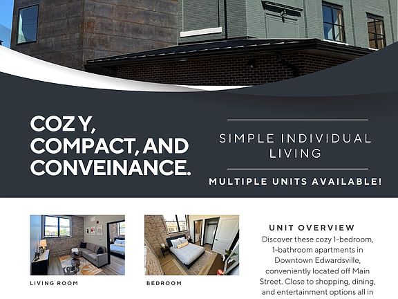 Images reflect a staged unit. Discover these cozy 1-bedroom, 1-bathroom apartments in Downtown Edwardsville, conveniently located off Main Street. Close to shopping, dining, and entertainment options all in walking distance. With 14 units available on the second and third floor these units would make the perfect home for students, single living, bachelors, or traveling employees. Rent expenses include water, sewer, trash, and a monthly laundry allowance done right inside the building. 1 reserved parking space provided with street parking available, too.