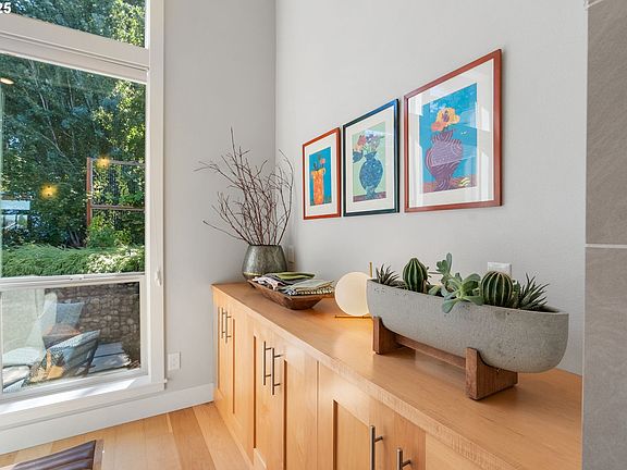 Set on a quiet cul-de-sac across from the Indian Creek Trail, this 2018 custom-built Hood River home offers 3 bedrooms, 2.5 bathrooms, an office, and 2,076 sq ft of light-filled living space. The great room, with vaulted ceilings, a wall of south-facing windows, and a dramatic floor-to-ceiling tiled fireplace, connects seamlessly to the dining room and kitchen. The spacious primary suite features vaulted ceilings, a walk-in shower, dual sinks, and a soaking tub, creating a private retreat. Outdoor living is highlighted by a backyard garden oasis, multiple decks, raised garden beds, mature landscaping with drip irrigation system, and a welcoming covered front porch. Solar panels (owned) and an on-demand hot water heater enhance energy efficiency, and the garage includes an art studio with utility sink and ample storage. Loved by its original owner for its brightness, sense of space, storage space, and peaceful setting, this home offers Mt. Adams views, trail access, and exceptional privacy in a desirable location. This is a home you won't want to miss; contact an agent to set up a private showing of this lovely home.