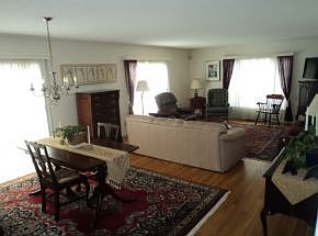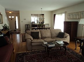 Sunny and ideally located on the end, with private fenced patio & garden. First floor master bedroom w/ slider to 2nd patio. First floor has hardwood flooring throughout and garage has entry ramp. Spacious eat- in kitchen, with breakfast bump out. Large formal dining room w/ slider to patio & opens to living room. Perfect floor plan flow for entertaining. Second floor bedrooms, bath & two double storage closets. First floor laundry and separate utility room/workshop w/ additional storage.
