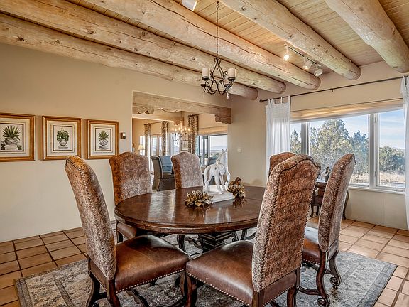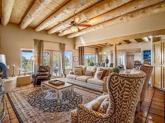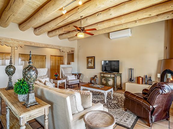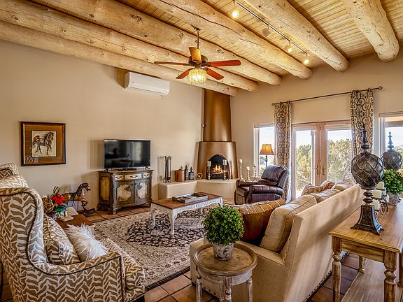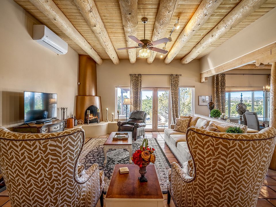 traditional Santa Fe style, featuring vigas, two kiva fireplaces, and Saltillo tile flooring in its