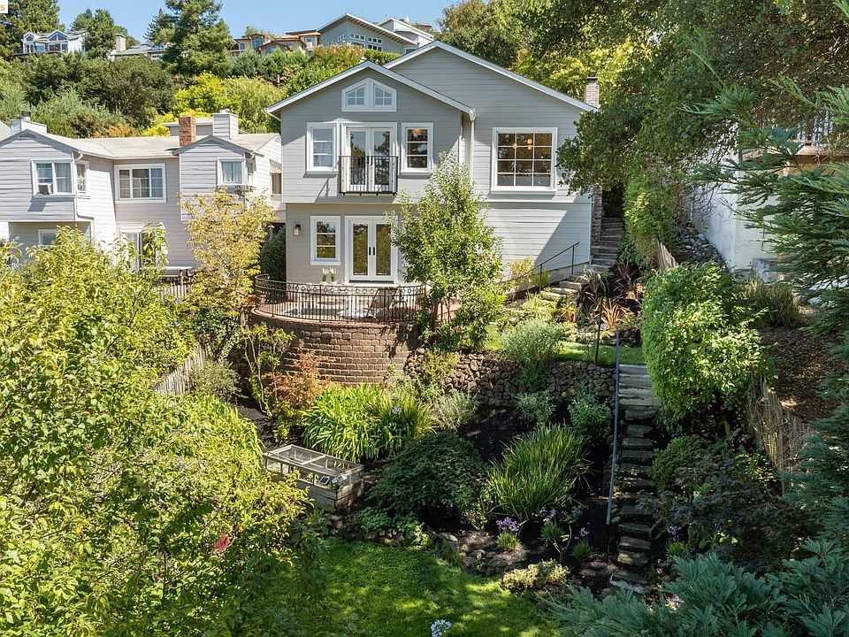A slice of European living in the Montclair Hills awaits. Through the grape-stake wooden gate, you'll find private gardens with the scent of sweet flowers and a lush green lawn. Inside, old-world charm seamlessly blends with a stylish kitchen and baths creating a serene escape. Natural light floods the living and dining rooms through expansive storybook windows showcasing stunning Bay views & sunsets. This home epitomizes 1940's architecture with a high-pitched ceiling, a Juliette balcony, & a cozy wood-burning fireplace. The sun-filled kitchen opens to the dining room, making it the heart of the home for gatherings and entertaining. The main house features three bedrooms and two freshly renovated baths, including a spacious primary suite with a romantic brick patio—perfect for morning coffee while overlooking the hillsides and picking an apple. The enchanting backyard offers blooming gardens, vegetables, and verdant lawns surrounded by shade trees—ideal for summer evenings sunset dinners or days of play. Don’t miss the detached cottage with a full bathroom, a versatile space for today’s lifestyle. Mins from Montclair Village, hiking and biking trails, and with easy freeway access, this home is perfectly situated. Relax, enjoy a glass of wine, watch the hawks soar, you are home.