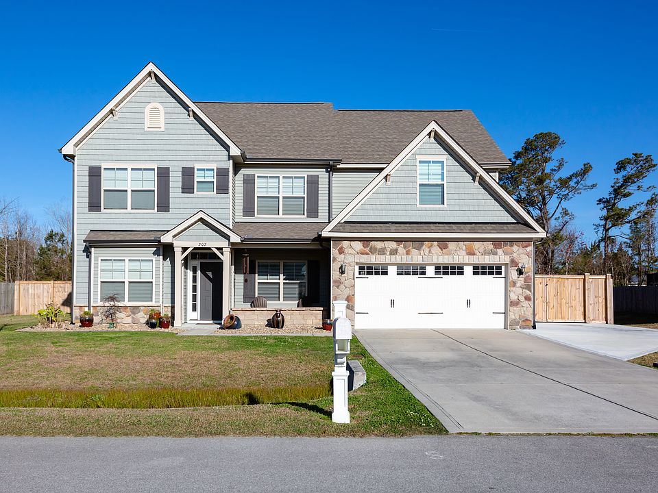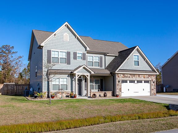 While officially a 4 bedroom, this house actually has an additional downstairs bedroom with a closet, an office downstairs, and a HUGE finished room over the garage with a closet as well. Seller is including a 1 year home warranty. This home has only had one owner and is in the perfect location for proximity to the bases and local amenities as well as just across the city lines in the county. It’s located in the quiet Coles Farm West community with multiple cul de sacs. The downstairs has a completely open floor plan with lots of space, one guest bedroom and full bath, an office room with French doors (not counted as a bedroom), dry bar space between the kitchen and forms dining room, a mud room off the garage, and a ‘media room’ just off the kitchen which could be used as a small family office. The upstairs has the remaining 4 bedrooms and finished room over the garage, 2 full baths, and the upstairs laundry room. The master suite includes a large bedroom, two walk in closets, and the master bathroom. Outside has been recently upgraded and is perfect for kids, dogs, and parties. It now has a fully fenced in yard, a shed, and a concrete patio extending from the driveway down the side of the house and 3/4 of the way across the back. The patio includes sufficient space for a boat or RV behind the fence, a built in fire pit, and a bolted in canopy with mosquito and sun screens. The front and side gardens areas are filled with river rock that matches the home and ceramic pots for planting making maintenance extremely easy. Attached 2 car garage is large enough for 2 vehicles or a weight room and storage. Appliances, including fridge, will be staying with the home. Location is about 10 minutes drive to the gates at Lejeune, 20 minutes from New River, and 1 hour from Cherry Point. We are 10 minutes from the ‘mall’ or Western Blvd (the main thoroughfare), and 30 minutes from Onslow Beach on base. As stated above, the home is located in the county so not subject to city taxes. Expansion of Piney Green road was recently completed from a 2 to 4 lane road but the property is far enough from the main road that there’s is no noise pollution. The area is expanding and home prices continue to increase year after year. Ready to show immediately, ready for move in this summer. We ARE willing to show to and consider offers from buyers with an agent.