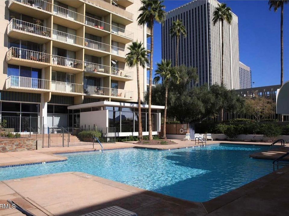 Mid-century modern 2 bedroom condo on the top floor of Executive Towers. Beautiful views of downtown Phoenix and South Mountain. You can see from ''A'' mountain (ASU) all the way to the West Side!! With this unique urban condo living, residents have access to a private parking garage to the south, access to a community pool /spa BBQ , resident clubroom and indoor gym. Indoor coin operated laundry facility. In the lobby a 24-hour doorman greets residents and guests. Walking distance to shops and restaurants along Central. The current owner will allow the furniture to be sold on a separate bill of sale.