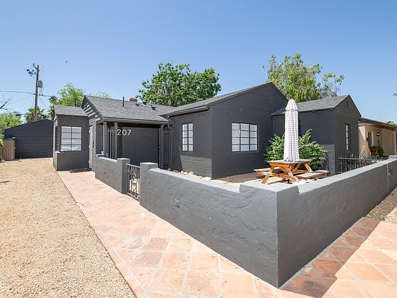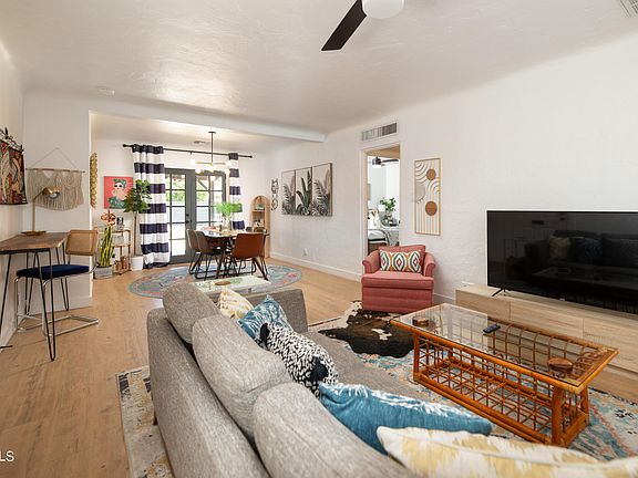 This boldly designed, turn-key home in the whimsical, well-maintained and centrally located neighborhood of Myrtle Park has a sophisticated, modern wow-factor that is incredibly popular with house-hunters of all kinds. Walking distance to LUX Coffee and the Phoenix light rail system, this striking, contemporary, sturdy brick beauty was originally meant to be a long term hold, and it shows! The sleek front elevation is softened and enhanced by a joyful landscaping package, flagstone patio with fire pit, dramatic exterior paint, and newly restored historic windows. With a 2B/1b main house of 1,049 sf, and a rear 350 sf studio + bath +loft + kitchenette there's a ton of potential for all types of lifestyles and living configurations. The interior of the main house features a well laid-out, open-concept floorplan with elegant geometric ceramic tile, *fossilized sandstone* countertops (yes, it has fossils in it!), countertop-to-ceiling tile backsplash, new custom shaker cabinetry with modern hardware, Classic (brand) retro gas range with shiplap wrapped vent hood, built-in kitchen conversation nook window bench, convenient drop-zone cabinet bank at the side entry door, kitchen pantry with tons of shelving and storage, and modern lighting and plumbing fixtures throughout! The main house boasts two excellently sized bedrooms, larger restored light-filled historic windows, a remodeled full bath, and a large section of original built-ins in the hallway. The French doors lead from the dining room to the spacious patio that is fashioned to be partly private from the rear yard, feeling like an added exterior room out of a bohemian dream. Mature trees and new landscaping provide a shady, charming al fresco outdoor dining space, and a larger sized lot and fully fenced rear yard create an area big enough to host parties and gatherings. The private and separate open beam style studio outbuilding was completely renovated to add vaulted ceilings, upgraded spray foam insulation for energy efficiency, new kitchenette and new 3/4 bath, and finishings all on the level of the main house. Best of all, the studio boasts a cozy lighted loft space for which the new owner can imagine all kinds of uses! Additional features include a new roof on both the main house and the studio, new ABS sewer line, a large gravel driveway boasting ample off street parking (4 spaces), new mini-split AC in the studio, newer ABS sewer running from the house to the main city line, newer water heaters, new retro style appliances, and new upgraded plumbing and lighting futures throughout. The place that you live (and work!) should inspire you. Rarely do you find such drama and contrast as complimentarily contained in one house, in one cohesive design. The space has been well maintained by the tenant for 2 years, keeping it spic and span as a short term rental, and now it's ready for its new owner. If you want to live somewhere that inspires you - don't miss seeing this one!