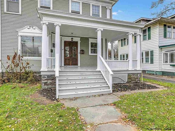 A charming uptown Kingston home offering a large covered front porch and off street parking. The home features original wood detailing, hardwood floors throughout most of the home and three original fireplaces to keep the home warm and cozy. The first floor apartment features well maintained and spacious living and dining rooms, complete with fireplaces, full of natural light and perfect for entertaining. Just off the dining room is the bedroom with french doors leading to the backyard, a full bath and an eat-in kitchen. A foyer with a classic wood staircase leads you to the second floor apartment, where the home continues to shine. Two nicely sized bedrooms with hardwood flooring and a beautiful den with an original fireplace, a full bath and an eat-in kitchen with a walk-in pantry. An original staircase leads to the walk-up attic with two rooms and a third full bath. The basement has good ceiling height, a washer and dryer and 200 amp electric service. The home is walking distance to Forsyth Park, Dietz Stadium, Trailways bus terminal and Uptown shops and eateries. There are endless possibilities with this property! Easily convert this to a single family living, or purchase for an investment rental, an owner-occupied property or an AirBnB property.