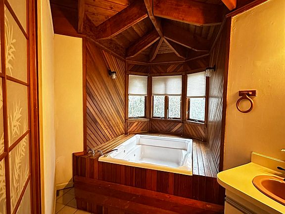 CONTINGENT UPON SELLER FINDING SUITABLE HOUSING! Spacious and romantic master suite featuring a large private bath with a luxurious whirlpool, offering scenic views of the huge backyard and its stunning wood inlay ceiling. Enjoy the updated kitchen boasting granite countertops, cathedral ceilings, a wood-burning fireplace with stone backing, built-in microwave, and gas appliances. Additional amenities include a detached garage with a loft (LOFT in need of some repairs, GARAGE sold as-is) and convenient inside access to a partial basement, ideal for all your storage requirements.