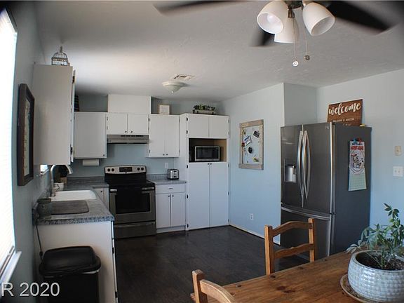 New exterior paint, updated interior paint colors and white cabinets. Fenced yard with front lawn and backyard access. Open and spacious kitchen with dining area and tile in laundry area and bathroom. Ceiling fans and blinds through out. Horse property on half an acre.