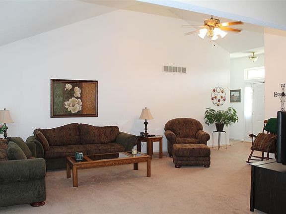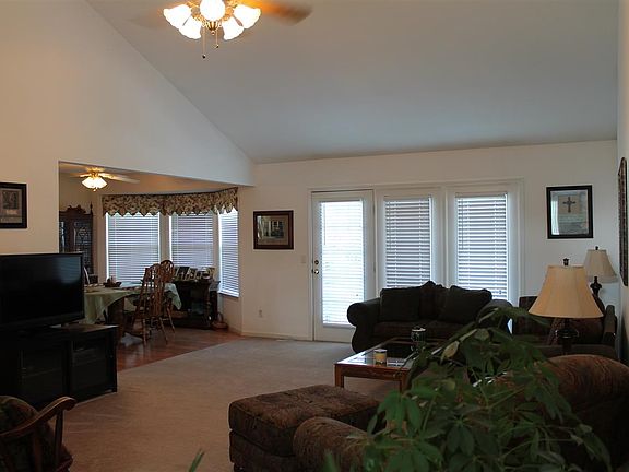 Ranch home with full walkout basement in Hunters Ridge subdivision just west of Sedalia. This home is at the end of a cul de sac. Setting on almost half an acre. Maintenance free vinyl siding, vinyl tilt in thermal pane windows. Architectural shingled roof. 3 bedrooms, 2 full baths on the main floor. Eat in kitchen with bay window, kitchen comes with all appliances including dishwasher, built in microwave and pantry. Large living room with 13' cathedral ceiling, brick gas fireplace and 9' wide 3 lite- french doors leading to 12x14 ft. deck. Large master bedroom suite with walk in closet and double sink vanity. Unfinished full sidewall walkout basement with 2 full size windows and 9' wide 3 lite- french doors to patio. 25' deep 2 car attached garage with auto opener. Main floor laundry room, tiled floor bathrooms and atrium windows. Nicely landscaped yard with lots of plants and flowers.